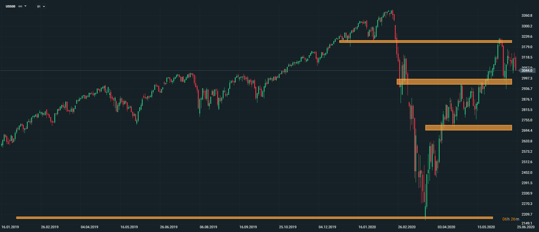 Americký akciový index US500 dnes zaznamenal pokles. V prípade pokračujúcej negatívnej nálady na trhoch sa môže pokles predĺžiť až k supportu okolo úrovne 2970 bodov. Zdroj: xStation5