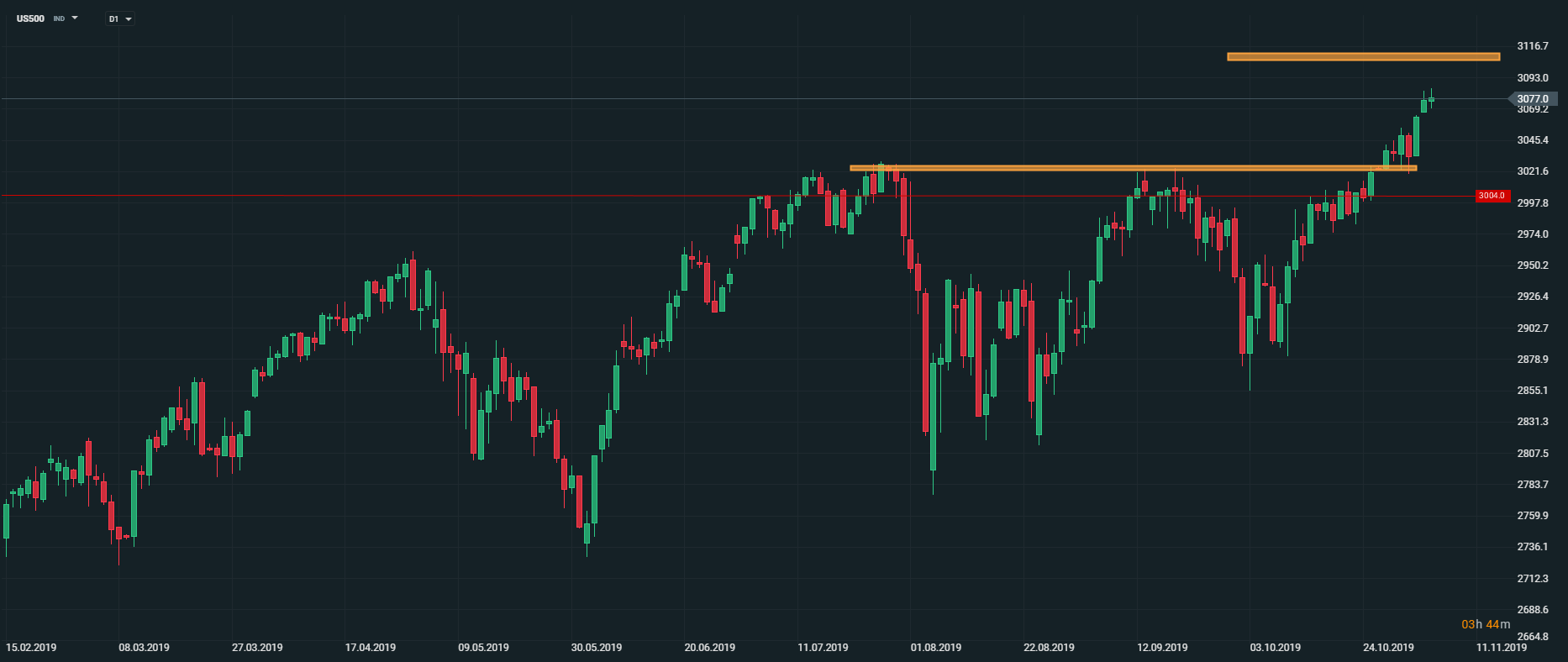 Akciový index US500 sa dnes odrazil od historicky najvyšších úrovní, pretože klesá pravdepodobnosť zníženia úrokových sadzieb v USA. Pozitívne správy ohľadom obchodnej dohody medzi USA a Čínou, by však mali podporovať index z pozvoľnom raste smerom nahor k psychologickej hranici 3100 bodov. Zdroj: xStation5