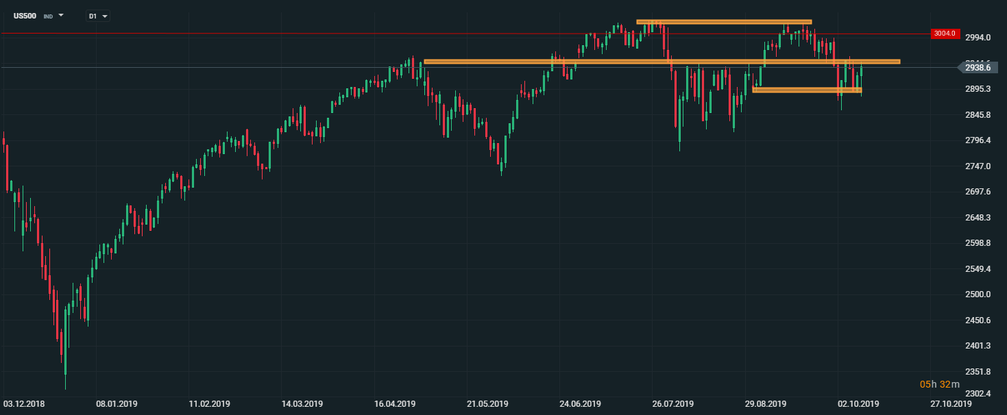 Americký akciový index US500 sa odrazil od supportu na úrovni 2940 bodov. Ďalší smer bude určovať to, či skutočne dôjde k progresu v americko-čínskych obchodných rozhovoroch. Zdroj: xStation5