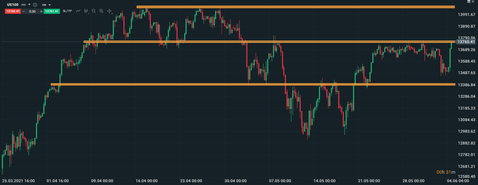 Americký akciový index US100 dnes zaznamenal prudký nárast a v súčasnosti testuje zónu odporu v oblasti 13760 bodov. V prípade prelomenia tejto úrovne sa otvorí priestor na dodatočný rast k historickým maximám, ktoré sa nachádzajú okolo úrovne 14 000 bodov. V opačnom prípade by mohla cena poklesnúť k hladine 13 400 bodov. Zdroj: xStation5