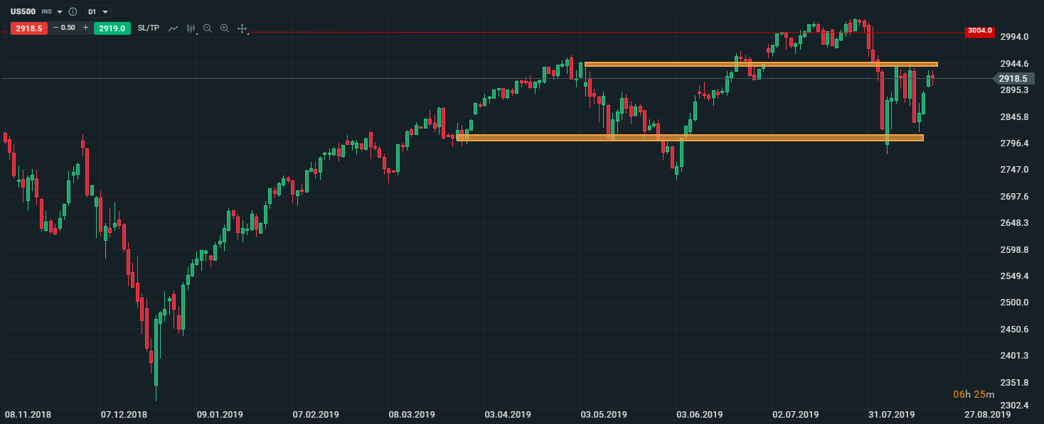 Americký akciový index US500 zatiaľ nedokázal prekonať kľúčovú rezistenciu na úrovni 2950 bodov. V prípade, ak v nasledujúcich dňoch dokáže uzavrieť denná sviečka nad vyššie spomínanou rezistenciou, otvorí sa priestor pre rast k historicky najvyšším úrovniam. Zdroj: xStation5