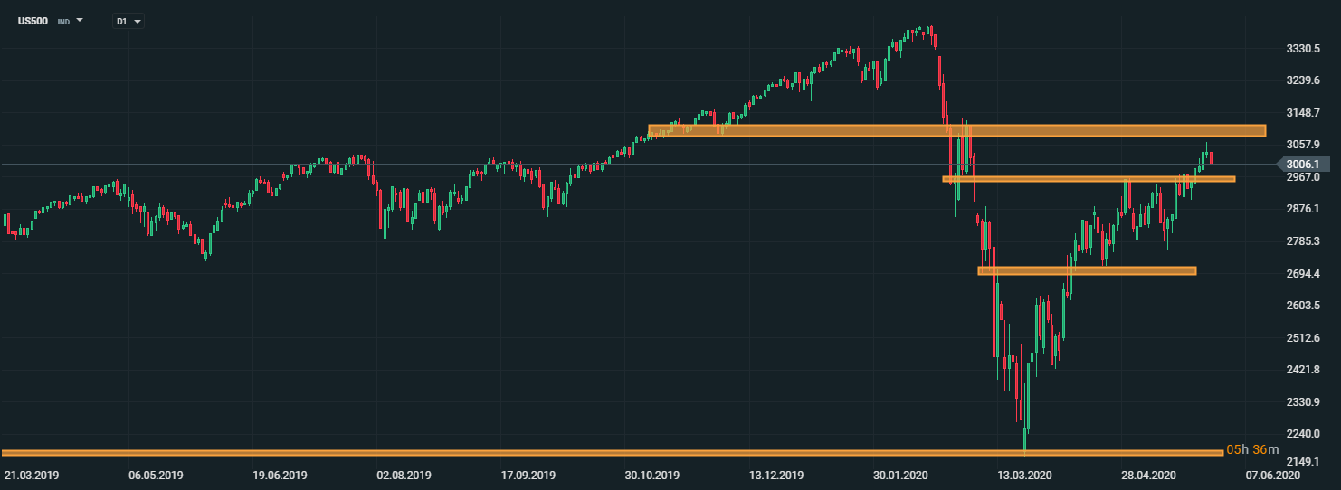 Z makroekonomického kalendára dnes boli zverejnené osobné výdaje za apríl v USA, ktoré zaznamenali pokles o 13,6%, pričom sa očakával pokles o 11,4%. Osobný príjem však zaznamenal nárast o 10,5%, pričom sa očakával pokles o 6,6%. Jadrová PCE inflácia zaznamenala medziročný nárast o 1%, pričom sa očakával nárast o 1,1%.