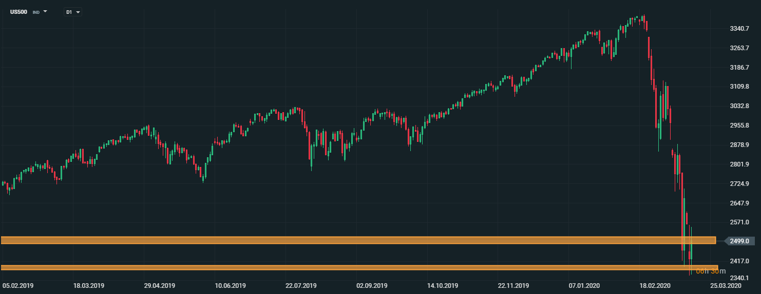 Americký akciový index US500 dnes testuje psychologickú hranicu 2500 bodov. V prípade, ak sa opäť objavia negatívne správy, je možné, že cena opäť klesne k lokálnym minimám okolo úrovne 2400 bodov. Zdroj: xStation5