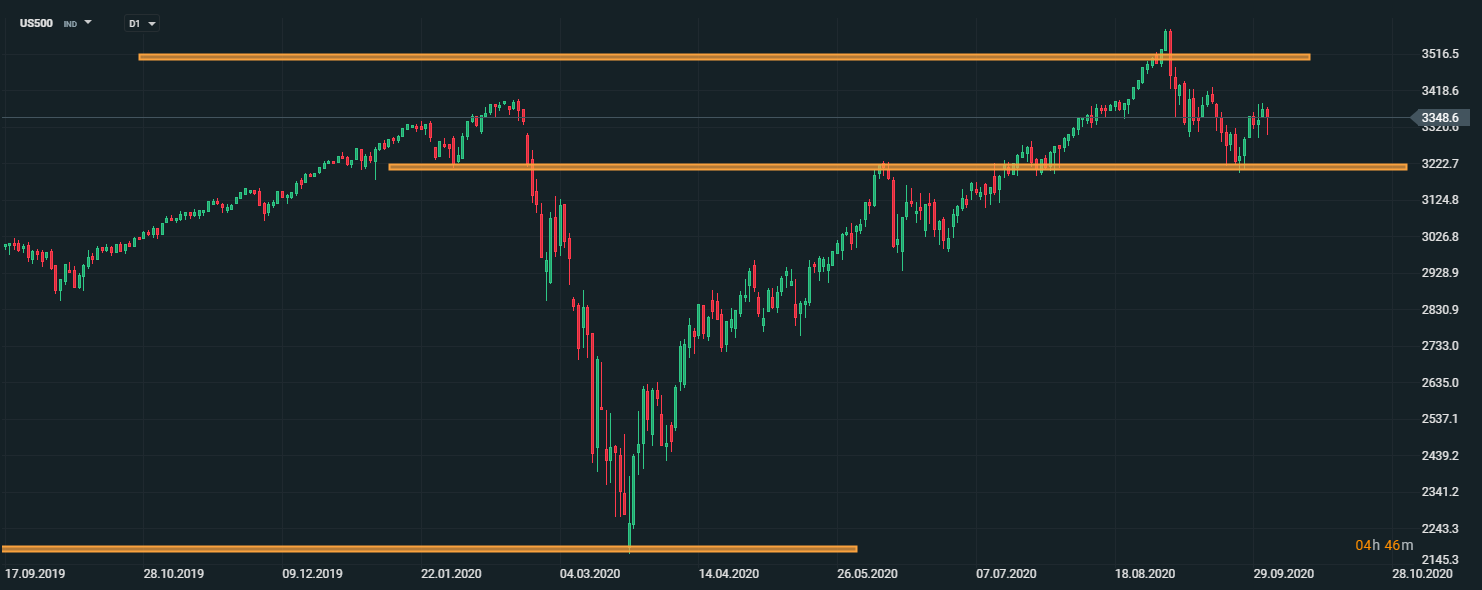 Americký akciový index US500 dnes síce zaznamenal pokles, no stále sa obchoduje nad hladinou 3500 bodov. V prípade, ak sa budúci týždeň objavia pozitívne správy týkajúce sa dodatočných fiškálnych stimulov v USA, akciový index môže pokračovať v raste k historickým maximám. Zdroj: xStation5