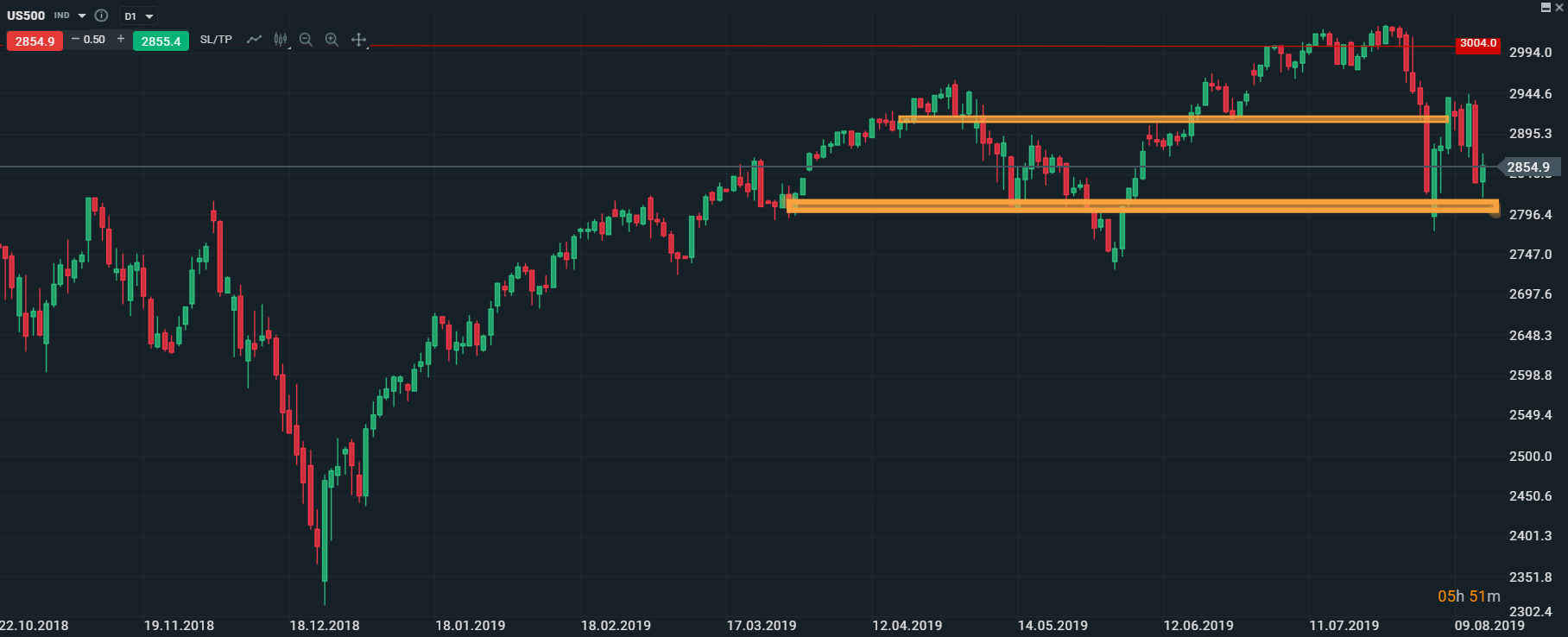 Americký akciový index US500 sa síce odrazil od kľúčovej úrovne 2 800 bodov smerom nahor, no negatívna nálada kvôli obchodnej vojne medzi USA a Čínou je zatiaľ stále v platnosti, a preto dnešný nárast môže byť len korekciou pred ďalším poklesom. Zdroj: xStation5