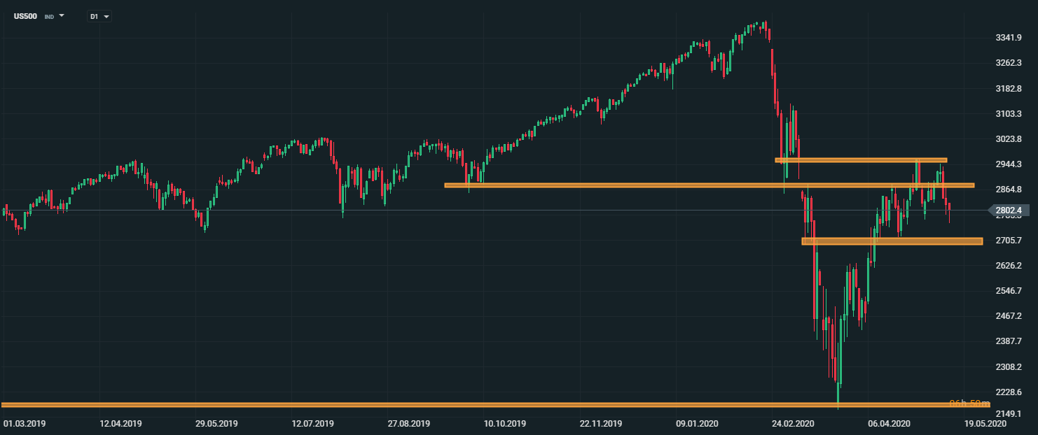 Americký akciový index dnes prekonal psychologickú hranicu 2800 bodov. V prípade, ak dokáže uzatvoriť denná sviečka pod vyššie uvedenou úrovňou, otvorí sa priestor pre dodatočný pokles k úrovni 2700 bodov. Zdroj: xStation5