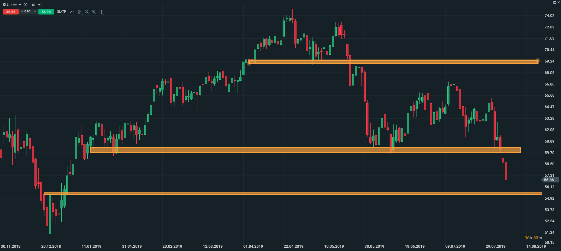 Ropa Brent (OIL) pokračuje v poklese. Pokles cien ropy podporuje neistota ohľadom obchodnej vojny medzi USA a Čínou, ako aj neočakávaný nárast zásob ropy v USA. Súčasný silný klesajúci trend by mohol pokračovať k úrovni 55 USD/bbl. Zdroj: xStation5