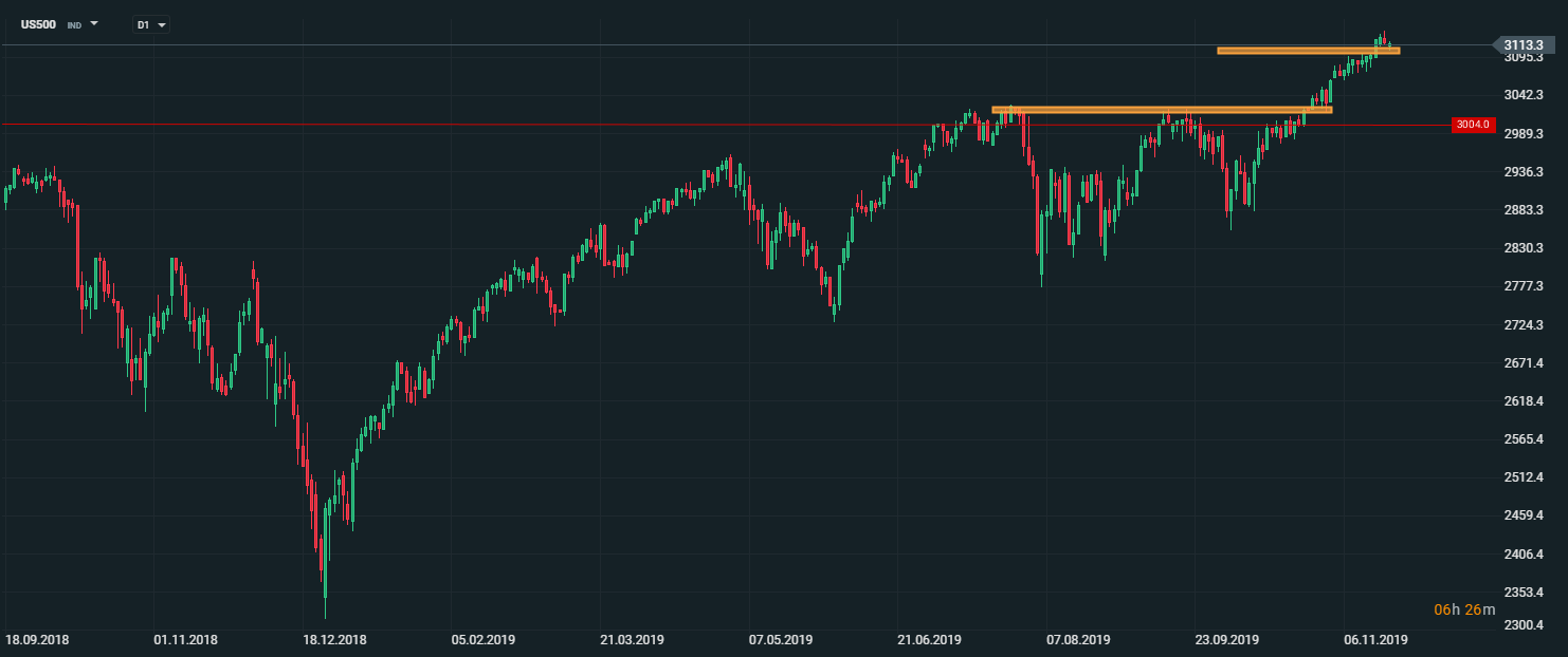 Americký akciový index US500 sa obchoduje nad hladinou 3100 bodov. V prípade, ak dokáže denná sviečka uzavrieť nad vyššie uvedenou úrovňou, otvorí sa priestor pre výraznejší pokles. Zdroj: xStation