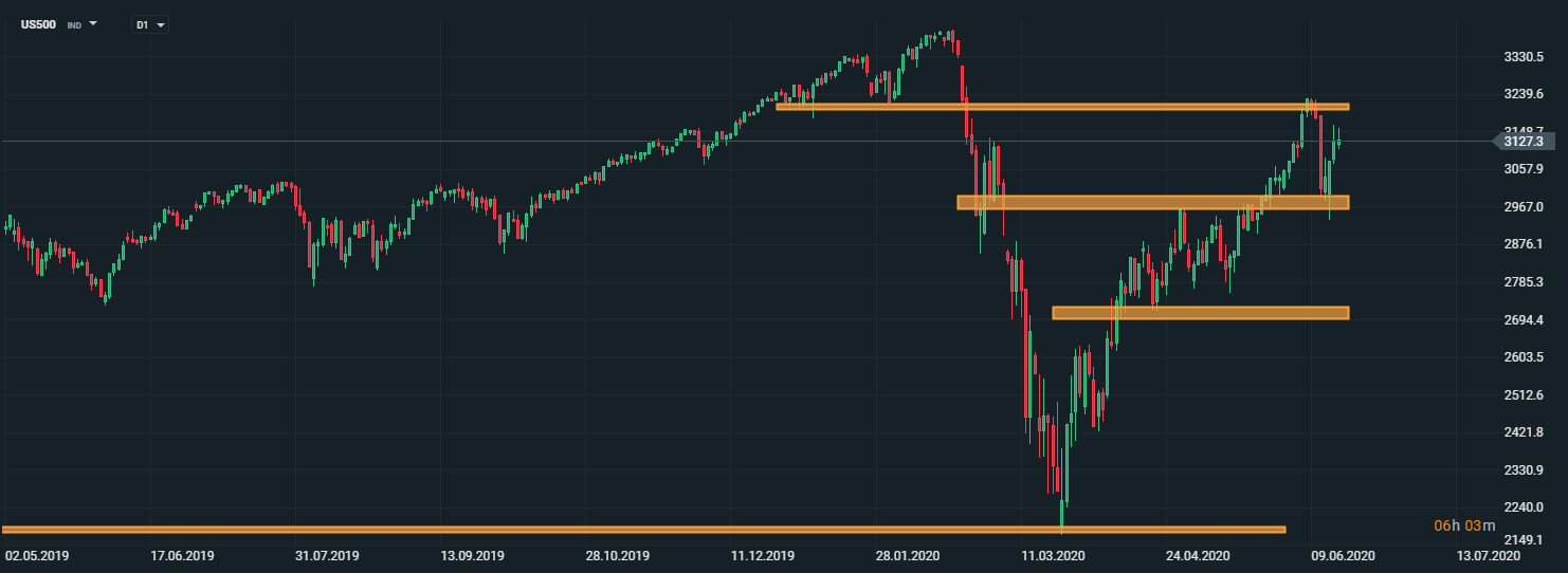 Americký akciový index US500 sa dokázal odraziť od supportu okolo úrovne 2960 bodov. V prípade pokračujúcej pozitívnej nálady na trhoch môže akciový index pokračovať v raste k lokálnym maximám okolo úrovne 3240 bodov. Netreba však zabúdať na to, že opäť začali rásť nové prípady koronavírusu, čo by mohlo narušiť pozitívnu náladu na trhoch. Zdroj: xStation5