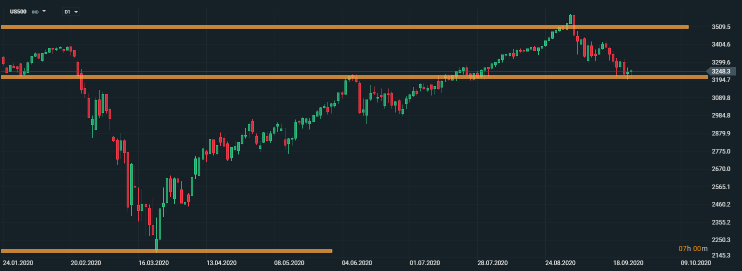 Americký akciový index US500 sa odrazil od podpory na úrovni 3200 bodov. V prípade, ak bude na trhoch pozitívny sentiment, cena môže zaznamenať rally k posledným maximám. Zdroj: xStation5