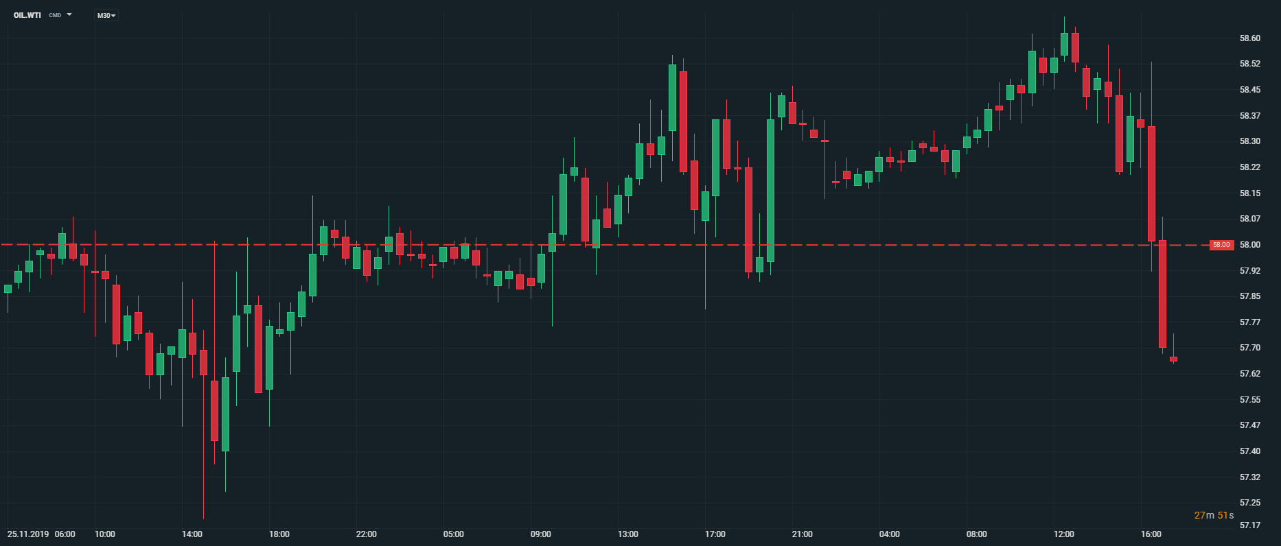Vývoj ceny ropy WTI v průběhu seance, M30. Zdroj: xStation5