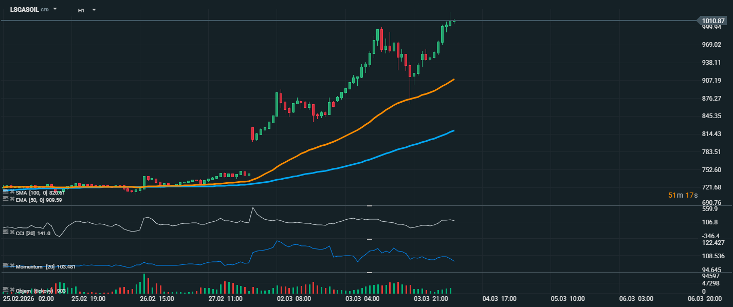 Na grafe LSGASOIL vidíme veľmi silný uptrend, keď cena vystúpila až k úrovni 1010,87 USD, čo predstavuje lokálne maximum. Cena sa aktuálne drží výrazne nad kĺzavými priemermi EMA 50 (909,59 USD) aj SMA 100 (820,61 USD), čo potvrdzuje silný býčí trend. CCI dosahuje hodnotu 141, čo signalizuje prekúpený trh a veľmi silné momentum kupujúcich. Takto vysoké hodnoty často sprevádzajú prudké impulzné pohyby, no zároveň môžu upozorňovať na možnosť krátkodobej korekcie alebo konsolidácie. Momentum sa stále drží nad neutrálnou úrovňou, čo potvrdzuje pokračujúcu rastovú dynamiku, aj keď na posledných sviečkach je viditeľné mierne spomalenie rastu. Objem obchodov navyše počas rastovej fázy výrazne vzrástol, čo naznačuje, že za pohybom stojí silná aktivita trhu. Z technického pohľadu je teraz najbližšia rezistencia v oblasti 1010–1020 USD, kde sa trh aktuálne nachádza. Ak by došlo k jej prelomeniu, môže sa otvoriť priestor pre ďalší rast smerom k 1050 USD. Naopak pri korekcii by prvá silnejšia podpora ležala okolo 940–950 USD, zatiaľ čo výraznejší support predstavuje oblasť okolo EMA 50 na 909 USD.