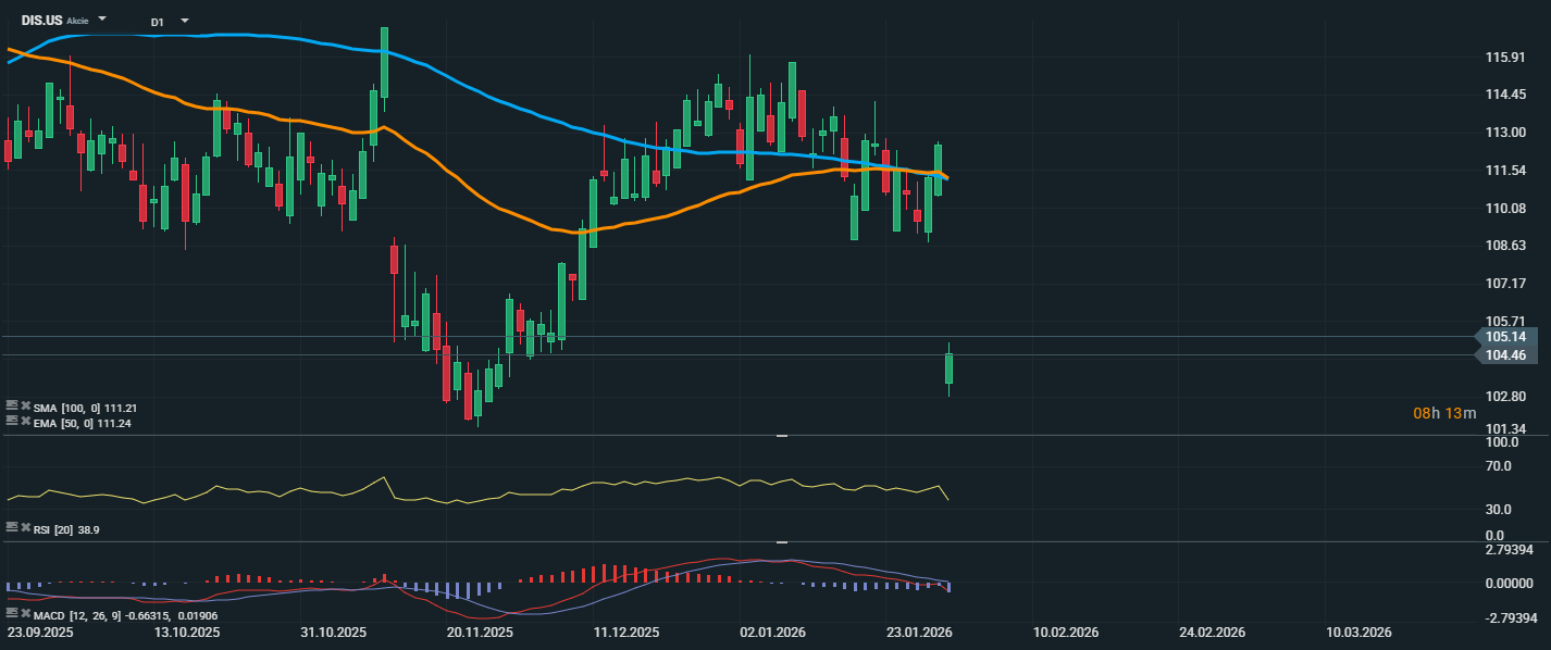 Akcie spoločnosti Walt Disney sa aktuálne obchodujú na úrovni 105,14 USD a cena zostáva pod kĺzavými priemermi EMA 50 (111,24 USD) a SMA 100 (111,21 USD). RSI sa nachádza na úrovni 38,9, teda v pásme slabého momenta, s náznakom odrazu z prepredaných úrovní. Z technického hľadiska bude kľúčové, či sa cena udrží nad úrovňou 105 USD a prípadne otestuje oblasť EMA 50. Bez trvalého návratu nad 111 USD však nie je možné hovoriť o zmene trendu.