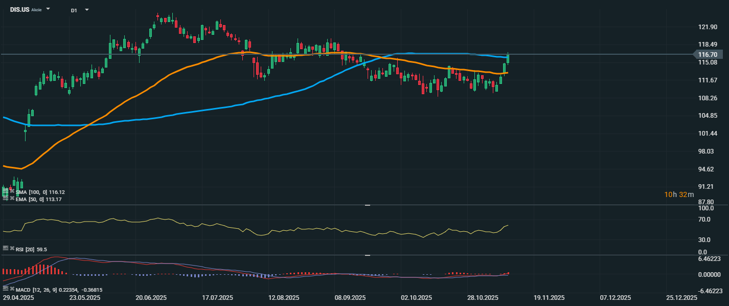 Akcie spoločnosti Walt Disney zaznamenali v posledných dňoch silný rastový impulz a aktuálne sa obchodujú na úrovni 116,70 USD, teda nad oboma kľúčovými kĺzavými priemermi. Cena prerazila nad EMA 50 (113,12 USD) aj nad SMA 100 (116,12 USD), čím vyslala silný býčí signál a prekonala dôležitý technický odpor. RSI poukazuje na rastúci nákupný záujem, pričom stále zostáva pod hranicou prekúpenosti (70), čo naznačuje priestor na pokračovanie rastu bez rizika krátkodobého vyčerpania.