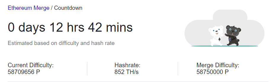 Google před dvěma dny zpřístupnil sledovač 'Ethereum Merge'. Transformace proběhne při obtížnosti TTD 58750000 t.j. za cca 12,5 hodiny. S ohledem na čas zveřejnění analýzy (18:30) proběhne sloučení kolem 6:30, 15. září. Zdroj: Google