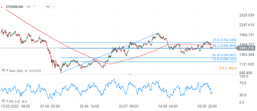 Etheruem, interval H4. Nálada kolem Etherea se zhoršila po včerejším negativním čtení inflace v USA. V současné době cena tokenu zažívá mírný pokles, nicméně vstup do oblasti pod 1580 $ by mohl předzvěst pokles až na 1300 $, což by se shodovalo s retracementem 61,8 Fibonacciho. Znepokojivě vypadá i re-entry pod klíčovým průměrem 200 relací, který běží na 1680 dolarech. Navzdory úspěšným testům Etherea existuje malá možnost technické chyby během 'The Merge', která by prudce snížila sentiment trhu s kryptoměnami a spustila likvidační vlnu. S návratem averze k riziku mohou někteří investoři chtít prodat tokeny v případě neočekávané chyby. Zdroj: xStation5