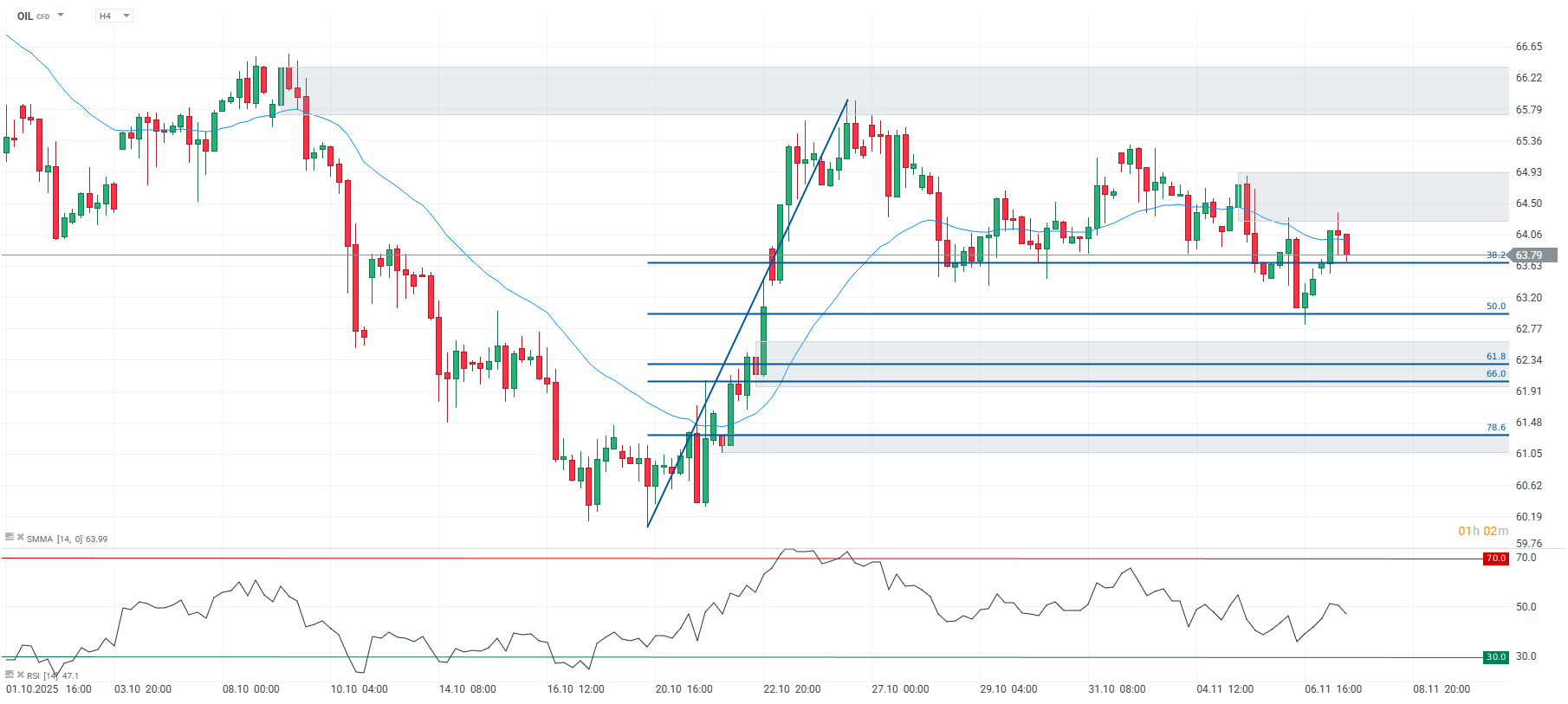 Pri pohľade na graf z pohľadu technickej analýzy vidíme, že cena ropy Brent sa už niekoľko dní pohybuje v mierne medvedom rozpätí. Momentálne sa odrážame od silnej zóny ponuky, ktorá prelomila lokálne minimá a spôsobila klesajúci moment. Pokiaľ ide o úrovne pod nami, kam by sa cena mohla dostať, prvou reakciou je dopyt na úrovni 62 libier. Okrem dopytu, ktorý spôsobil impulzívnu sviečku, existuje aj 61,8 a 66,0 Fibonacciho retracement. To bude dôležitá úroveň, od ktorej môžeme očakávať býčiu reakciu. RSI zostáva v neutrálnej oblasti okolo hodnoty 45.