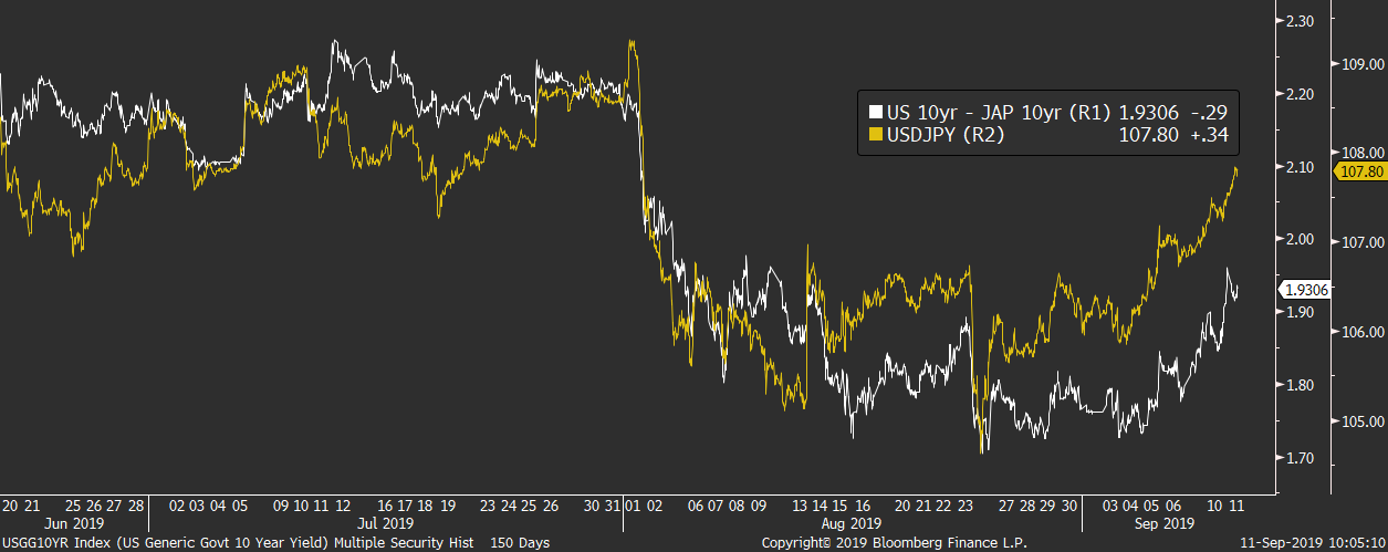 Korelace USDJPY a spreadu mezi US a JAP 10letými výnosy. Zdroj: Bloomberg