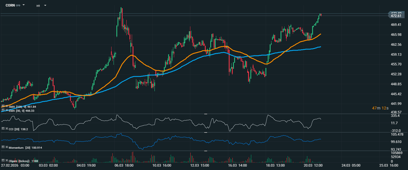 Cena kukurice sa vyšplhala k úrovni 472,61, čo predstavuje najvyššie hodnoty za posledné sledované obdobie a potvrdzuje pokračujúci krátkodobý rastový trend. Trh sa zároveň drží nad oboma kĺzavými priemermi, pričom EMA 50 sa nachádza na 466,33 a SMA 100 na 461,84. Toto nastavenie ukazuje, že kupujúci majú naďalej prevahu a doterajší rast si udržiava solídny technický základ. Pozitívny obraz podporuje aj CCI, ktorý sa pohybuje na zvýšených hodnotách okolo 138, čo potvrdzuje silné nákupné momentum, no zároveň už naznačuje aj možnosť krátkodobého prehriatia trhu. Momentum sa drží nad neutrálnou hladinou na úrovni približne 100,9, čím ďalej potvrdzuje silu aktuálneho pohybu.