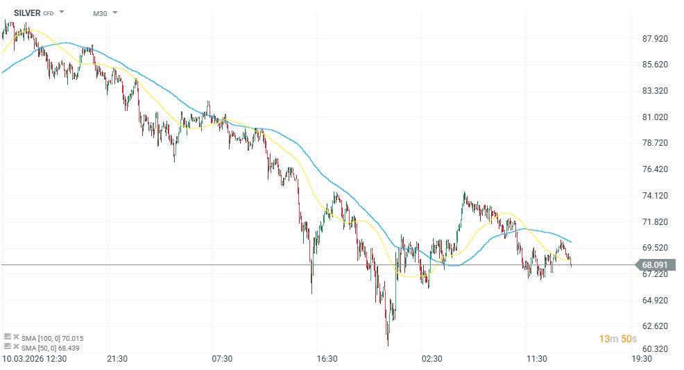 Pri striebre je situácia veľmi podobná, ale ešte o niečo volatilnejšia. Počas pondelkovej seansy sa striebro prepadlo o 9 % k hodnotám okolo 61 USD. Následne nastal podobný obrat ako v prípade zlata a striebro vzrástlo o viac ako 20 % až nad úrovne 74 USD. Z najvyšších hodnôt okolo 74 USD, ktoré boli dosiahnuté v stredu, striebro postupne klesalo. Aktuálne sa obchoduje okolo 68 USD, čo predstavuje pokles približne o 8 % oproti týždenným maximám. Celkovo tak striebro tento týždeň končí približne na podobných úrovniach a pripisuje si mierny zisk +0,7 %. Za posledný mesiac stráca výrazných -27 % a od začiatku roka je tiež v mínuse -3,9 %.