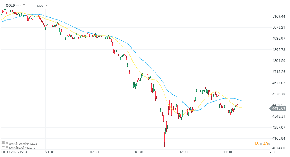 Tento týždeň bol pre zlato, striebro aj ďalšie drahé kovy mimoriadne dynamický. Na začiatku týždňa zlato prudko kleslo približne o 8 % až k hranici 4 100 USD, čo ukázalo, ako citlivo aktuálne trh reaguje na geopolitické správy a vyjadrenia Donalda Trumpa. Následne však prišiel silný obrat po odložení amerického ultimáta voči Iránu a zlato vystrelilo späť až k úrovniam okolo 4 600 USD. Aktuálne sa zlato drží okolo 4 400 USD. Napriek výrazným pohybom z úvodu týždňa je situácia na zlate počas dneška pomerne stabilná. Týždenná výkonnosť zlata je -1,7 %, za posledný mesiac potom -16 % a od začiatku roka si pripisuje viac ako 2 %.