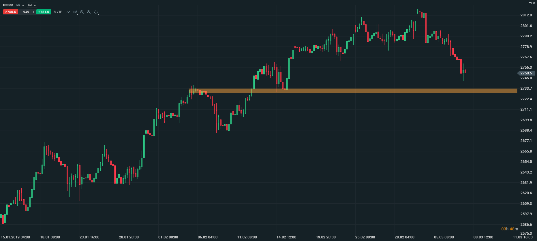 Na spomalenie očakávaného hospodárskeho rastu eurozóny zareagovali poklesom aj americké akciové indexy. Najvýraznejší rast zaznamenali akcie realitného sektora, najvýznamnejší pokles akcie cyklickej spotreby a finančného sektora. Index S&P 500 (US500 na xStation5) prerazil support v oblasti 2760 bodov, čím sa otvoril priestor na pokles k úrovni 2730 bodov.
