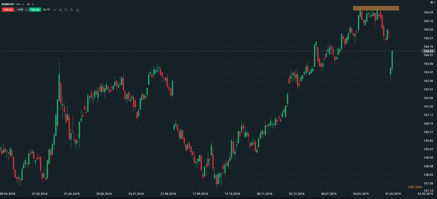 Zníženie makroekonomického výhľadu a odklad zvyšovania úrokových sadzieb poslali výnosy na európskych vládnych dlhopisov smerom nadol. Pokles pravdepodobnosti zvyšovania úrokových sadzieb, by mohol nastoliť v najbližších týždňoch rastový trend na cenách dlhopisov. Medzi cenou dlhopisov a úrokom je opačný vzťah. Ak klesajú úroky na dlhopisoch, rastie ich cena. Nemecké 10 - ročné dlhopisy (BUND10Y na xStation5), by mohli na základe týchto skutočností zaznamenať nárast k úrovni 167 bodov.