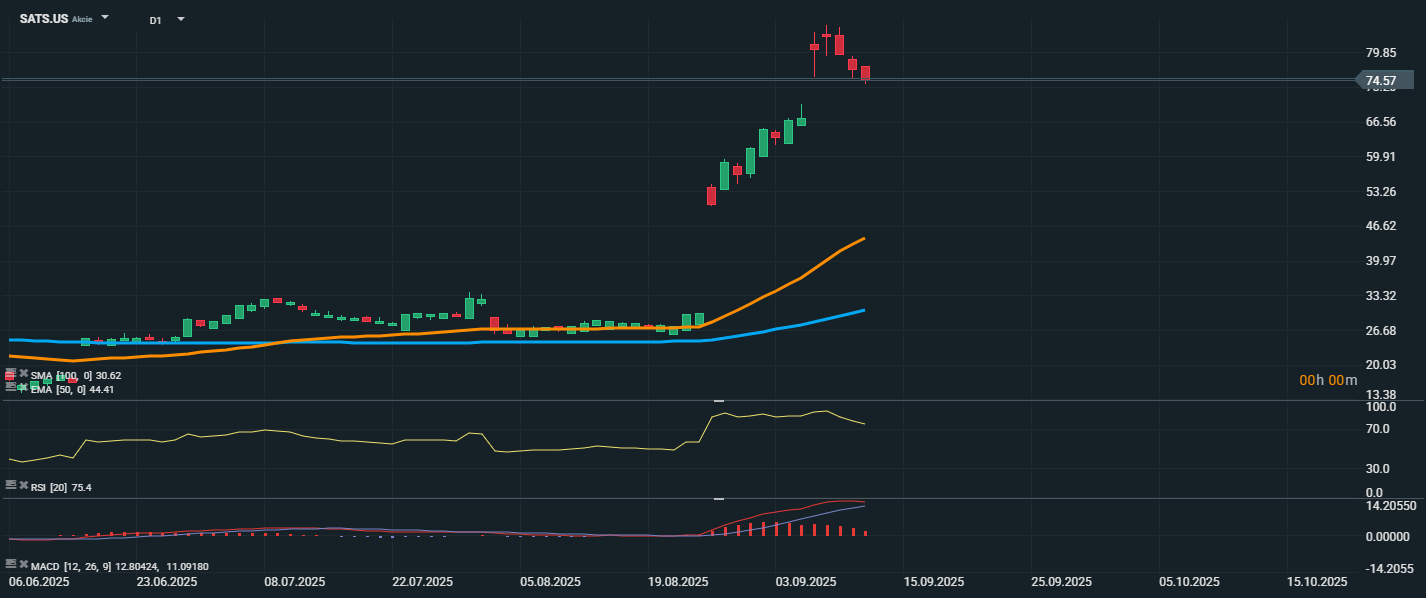 Akcie spoločnosti EchoStar (SATS.US) zažili v septembri mimoriadne silný rast a aktuálne sa obchodujú na úrovni 74,57 USD. Od začiatku augusta akcie viac ako zdvojnásobili svoju hodnotu. Cena sa teraz nachádza vysoko nad kľúčovými priemermi – EMA 50 (44,41 USD) a SMA 100 (30,62 USD) – čo potvrdzuje extrémne býčí trend.