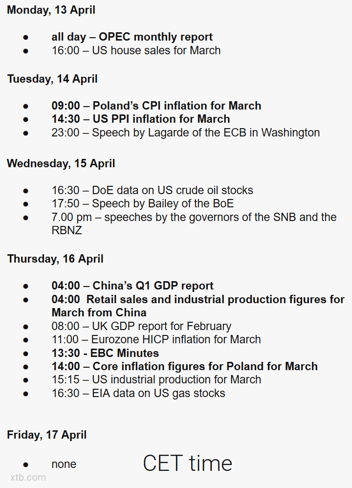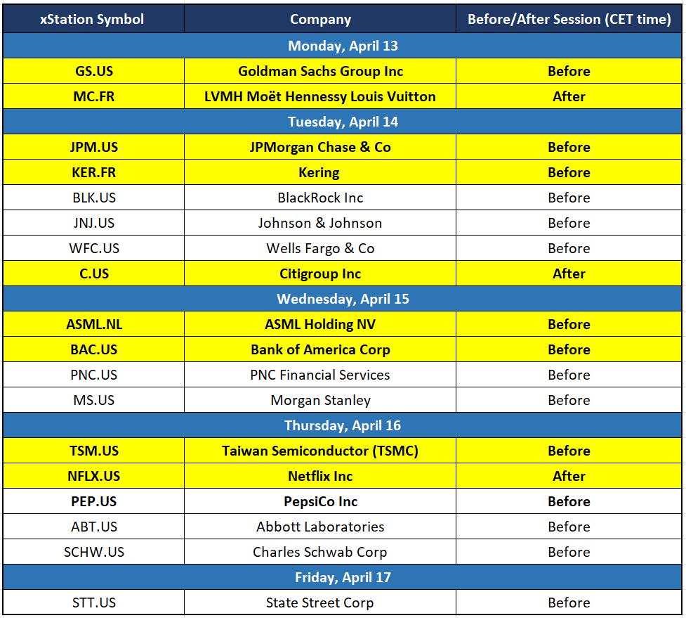V priebehu týždňa budú kľúčové tri veci: vývoj okolo Iránu, začiatok výsledkovej sezóny za 1. štvrťrok a makroekonomické údaje z USA a Európy, ktoré môžu buď potvrdiť, alebo spochybniť vplyv vyšších cien ropy na infláciu. Medzi očakávanými dátami sú poľská CPI, americká PPI, údaje o predajoch domov, zápisnica zo zasadnutia ECB, inflácia HICP v eurozóne a údaje z Číny, takže trh bude súčasne vyhodnocovať geopolitiku, infláciu aj výhľad rastu. Osobitná pozornosť sa zameria na banky, LVMH, ASML, TSMC a Netflix, pretože ich výsledky ponúknu prvý signál, ako sa firmám darí na začiatku výsledkovej sezóny.