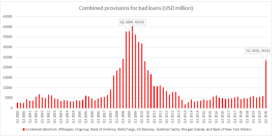 Vyššie uvedený graf znázorňuje vývoj rezerv na rizikové úvery u siedmych najväčších bánk v USA. Ako si môžeme všimnúť, v Q1 2020 vytvorili banky výrazné množstvo rezerv, čo predstavuje varovný signál, nakoľko kombinácia nesplácania úverov s poklesom spotreby by mohlo krajinu uvrhnúť do ďalšej fázy krízy. Zdroj: XTB Research