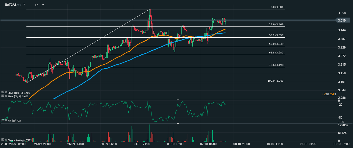 Cena zemného plynu sa aktuálne obchoduje na úrovni 3,510 USD, tesne nad 23,6 % Fibonacciho retracementom (3,468 USD). Trend zostáva rastový, čo potvrdzujú vyššie minimá aj maximá. Kĺzavé priemery EMA 50 (3,452 USD) a SMA 100 (3,426 USD) boli prerazené smerom nahor a v súčasnosti fungujú ako podpory. Cena sa od týchto úrovní niekoľkokrát odrazila, čo potvrdzuje silu kupujúcich. Williams %R sa pohybuje okolo -21, teda v blízkosti prekúpenej oblasti, no stále mimo extrémnych hodnôt. Objem obchodov zostáva zvýšený, čo podporuje pokračovanie rastového trendu.