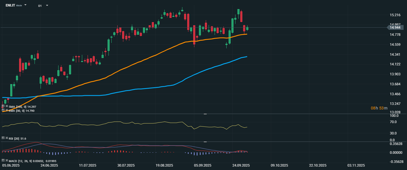 Aktuálne sa cena pohybuje na úrovni 14,944 EUR, tesne nad kĺzavým priemerom EMA 50 (14,790 EUR), ktorý spolu so SMA 100 (14,297 EUR) slúži ako kľúčová dynamická podpora. Obe krivky majú rastúci sklon, čo potvrdzuje pokračujúci strednodobý býčí trend.