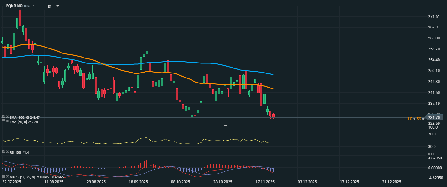 Akcie nórskej energetickej spoločnosti Equinor sa aktuálne obchodujú na úrovni 231,70 NOK, teda výrazne pod kĺzavými priemermi EMA 50 (242,78 NOK) a SMA 100 (248,47 NOK). To poukazuje na pretrvávajúce medvedie momentum a potvrdzuje klesajúci trend, ktorý akcie sledujú už niekoľko týždňov. RSI sa nachádza pod neutrálnou hodnotou 50, no zatiaľ mimo pásma prepredanosti, čo naznačuje trvajúci tlak na pokles bez známok extrémneho vyčerpania.