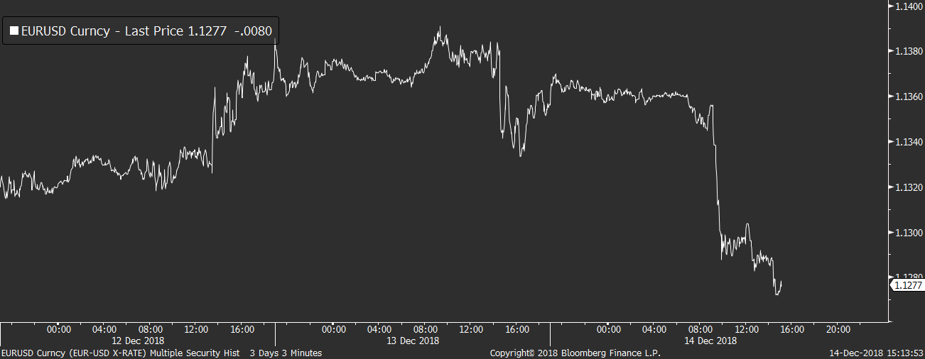 Po sérii slabších dat z Číny, kde zklamaly výsledky maloobchodních tržeb a průmyslové produkce, dnes nijak nenadchla ani Evropa. Ta zveřejnila výsledky PMI, které hlavně ve Francii prudce klesly a dostaly se dokonce až pod hranici 50b. Na vině je jsou hlavně protesty žlutých vest, ale rozhodně nejsou jediným důvodem. Pád PMI totiž není ničím novým a týkal se také německa. Přičteme-li k němu i zprávy o dalším propadu (-8 %) v počtu registrací nových automobilů, dostáváme nepříjemný mix, který zanechal negativní stopu nejen na indexech, ale také na euru. To na páru s dolarem neudrželo support 1,13 EURUSD a aktuálně útočí na minima z konce minulého měsíce.