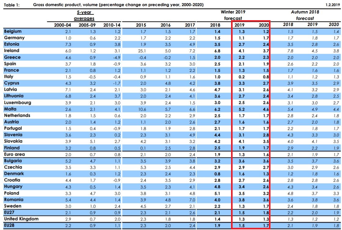 Celkovo sa v roku 2019 najpomalší rast očakáva v Taliansku (0,2%), Nemecku (1,1%) a na treťom mieste sú Belgicko, Francúzsko spolu s Britániou (1,3%). Na druhej strane rebríčka sú Malta (5,2%), Slovensko a Írsko (4,1%; hoci pri írsku je to viac účtovná ako reálno-ekonomická záležitosť).