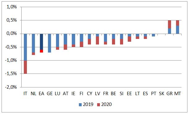 K ešte výraznejšej revízii smerom nadol došlo pri HDP. A to z 1,9% na 1,3% v roku 2019 a z 1,7% na 1,6% v roku 2020 (ECB v decembri prognózovala rast na úrovni 1,7% pre 2019 aj 2020). Nižší rast = nižšie inflačné tlaky, čiže je tu ďalší dôvod pre ECB aby nezvyšovala úroky. Čo sa týka štruktúry, tak keď spočítame roky 2019 a 2020, tak k najväčšej revízii nadol došlo v Taliansku (-1,5 perc. bodu); Holandsku (-0,8 p.b.) a Nemecku (0,7 p.b.). Naopak nahor bol revidovaný rast pre Grécko a Maltu (v oboch prípadoch o 0,5 p.b.) a nezmenený ostal pre Slovensko. Keď sa na geografickú štruktúru zmeny prognóz pozrieme z regionálneho hľadiska, tak najväčších revízií sa dočkali Taliansko a západné krajiny v Nemeckej ekonomickej sfére, naopak len drobných zmien sa dočkali krajiny bývalého východného bloku (ktorým pomáha prudký rast miezd) a väčšina krajín, ktoré sa stále spamätávajú z predošlých ekonomických problémov (Grécko, Španielsko, Portugalsko).