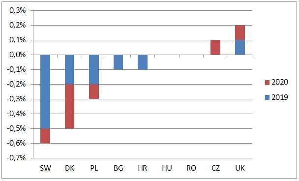 Čo sa týka zvyšných krajín EÚ, tak platí to isté – západné krajiny s vysokou expozíciou voči Nemecku (Švédsko, Dánsko) majú horšie revízie ako krajiny bývalého východného bloku. Pre Britániu bol dokonca výhľad revidovaný mierne nahor. Vzhľadom na posledné čísla z podnikovej dôvery v Británii to však môže dopadnúť inak, najmä pokiaľ by bol BrExit tvrdý.