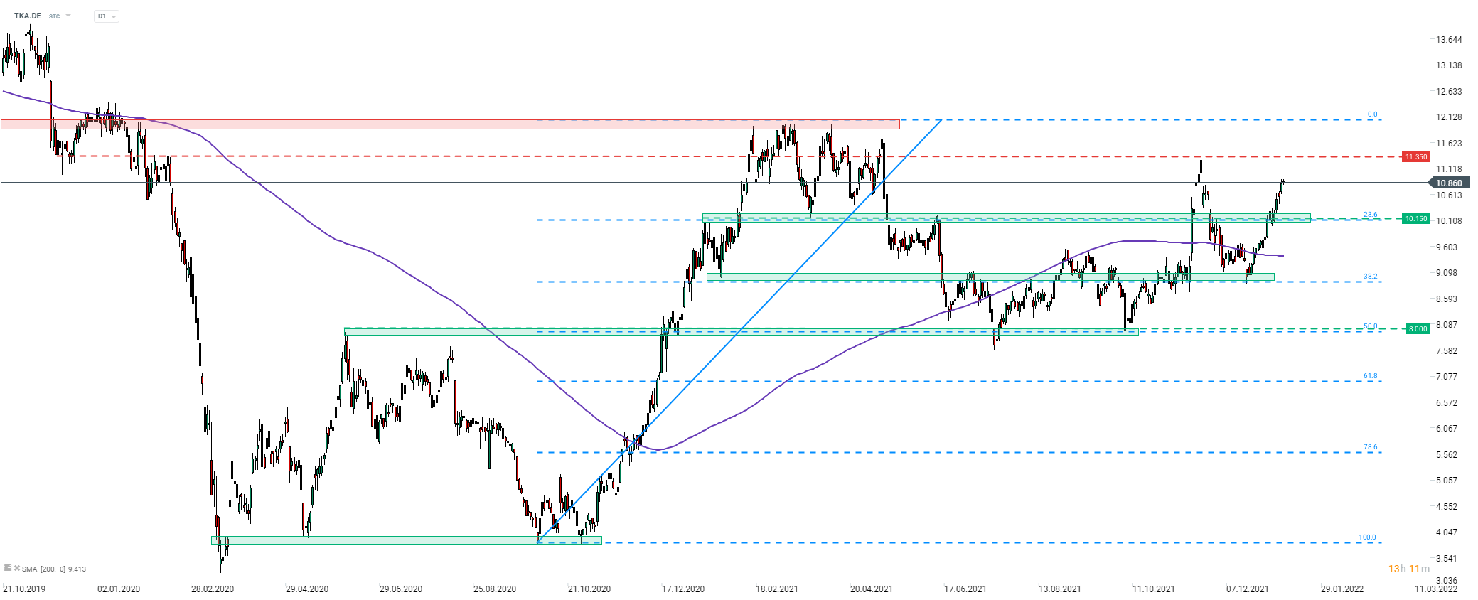 Akcie Thyssenkrupp (TKA.DE) sa obchodovali vyššie po tom, čo spoločnosť odhalila, že si plánuje ponechať väčšinový podiel vo svojej elektrolýznej jednotke, ktorá sa chystá vstúpiť na burzu. Akcie pokračujú v pohybe nahor, ktorý sa začal po odraze od podpory pri 38,2% retracemente. Krátkodobá rezistencia je označená lokálnym maximom z konca novembra (11,35 EUR). Na druhej strane, ak býci stratia kontrolu nad trhom a akcie začnú klesať, pozornosť sa môže presunúť na support, ktorý sa nachádza na hodnote 10,15 €. Zdroj: xStation5