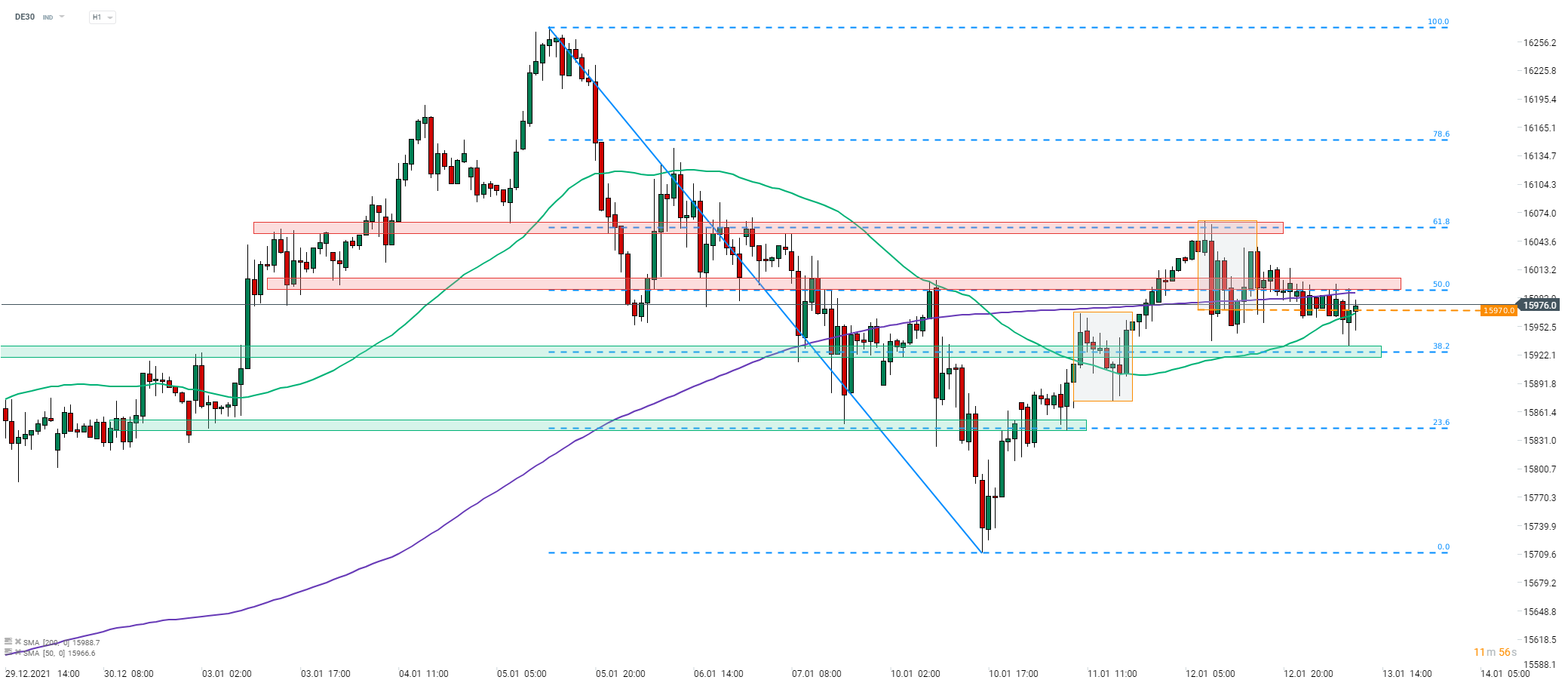 DE30 pomaly klesá nadol po neúspešnom pokuse o prelomenie sa nad 61,8% retracement zostupného pohybu spusteného minulý týždeň (16 060 bodov). Nemecký index neskôr klesol pod cenovú zónu označenú 50% retracementom a 200-hodinovým kĺzavým priemerom (fialová čiara), ktorá sa nachádza v oblasti 16 000 bodov a testoval podporu na úrovni 38,2% retracementu (15 925 bodov). Kým však index klesol pod spodnú hranicu geometrie lokálneho trhu na úrovni 15 970 bodov, podarilo sa mu rýchlo vrátiť späť nad ňu, čo signalizuje, že krátkodobý vzostupný trend ešte nemusí byť ukončený. Psychologická oblasť vo výške 16 000 bodov predstavuje krátkodobú rezistenciu.