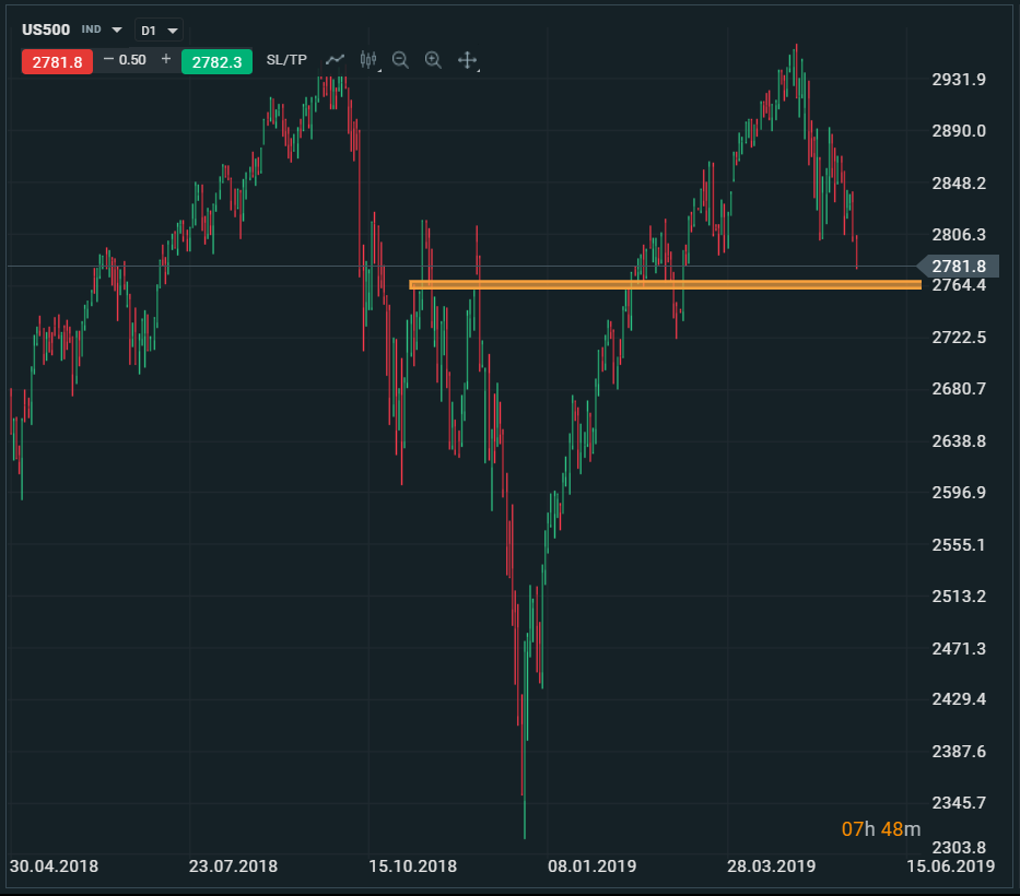 Akciový index US500 sa približuje k supportu na úrovni 2760/2750 bodov. V prípade prekonania tohto supportu, sa otvorí priestor na pokles k úrovni 2700 bodov. Zdroj: xStation5
