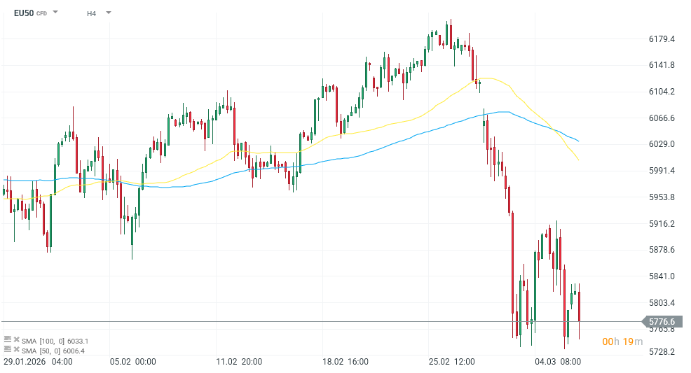 Nemecký index DAX sa momentálne obchoduje na úrovni okolo 23 850 bodov. Od začiatku tohto roka však stratil viac ako 2,5 %, čo odzrkadľuje opatrnosť investorov a zvýšenú volatilitu na európskych trhoch. Od začiatku konfliktu index DAX stratil viac ako 3 %, pričom pred konfliktom sa obchodoval nad hranicou 25 000 bodov. Podobný vývoj pozorujeme aj v prípade indexu Euro Stoxx 50, ktorý sa momentálne obchoduje na úrovni okolo 5 800 bodov. Za posledný týždeň index stratil 5 % a od začiatku roka EU50 stratil 1 %. Celkovo po počiatočnej panike európske indexy ešte neodzrkadľujú zvýšené geopolitické riziko a obchodujú sa len mierne pod svojimi historickými maximami.