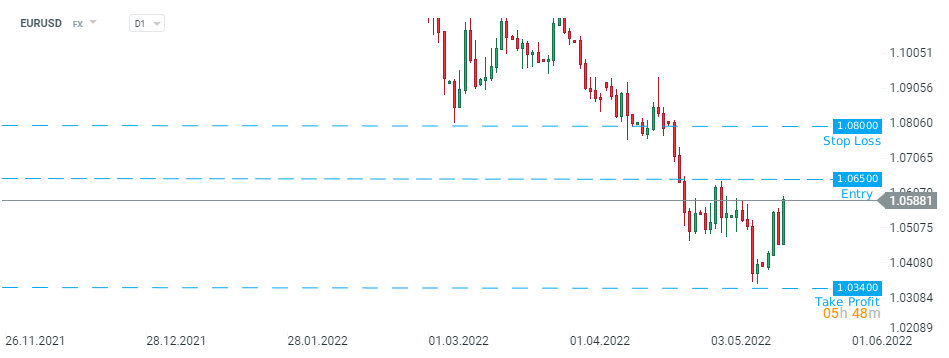 Credit Suisse doporučuje zadat short limit na EURUSD na 1,0650 s cílem 1,0340 a stop loss na 1,0800. Zdroj: xStation5