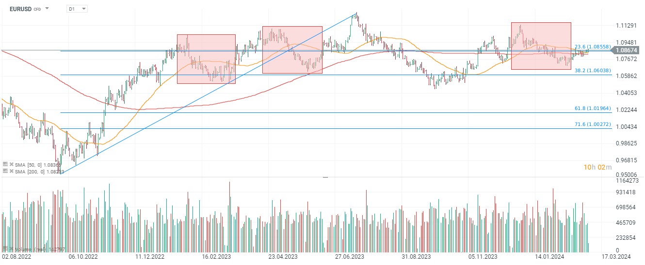 EURUSD zápasil s kľúčovou úrovňou odporu, ale nakoniec prelomenie páru nad úrovňou 23,6 Fibonacciho retracementu vzostupnej vlny z jesene 2022. Prelomenie nad touto úrovňou by mohlo otvoriť cestu k novým viacmesačným maximám smerom k 1,12.