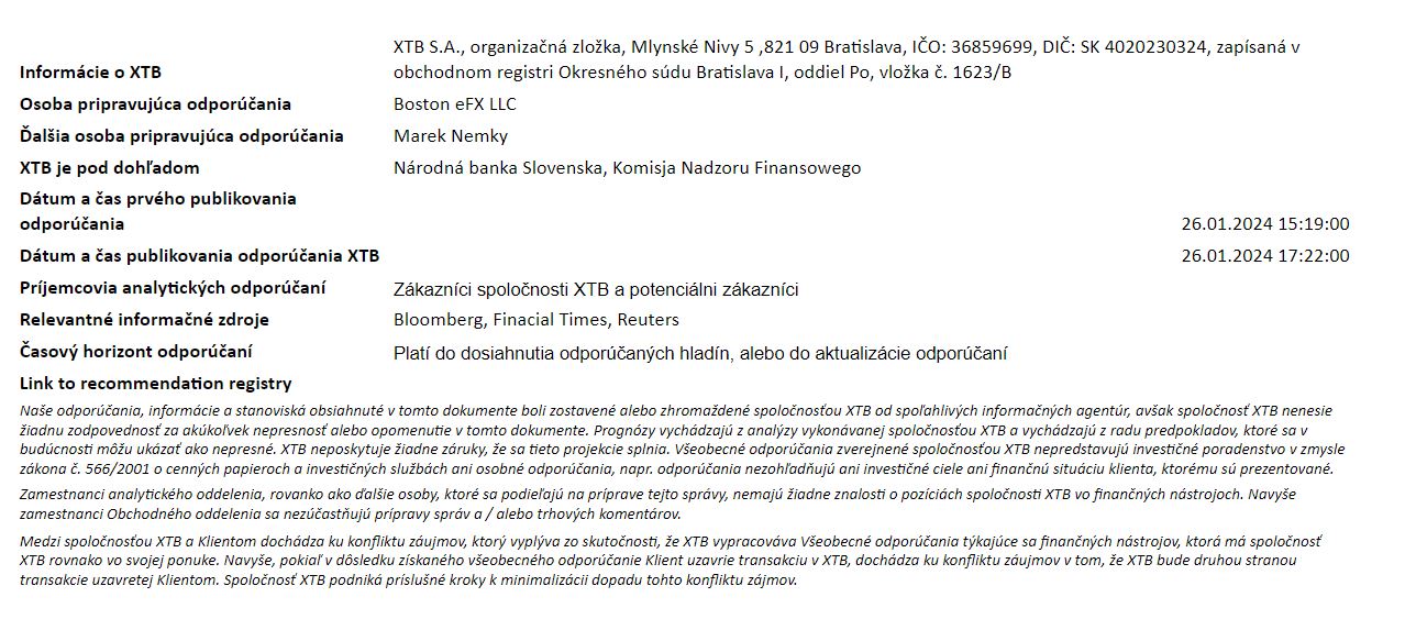 Tento materiál je marketingovou komunikáciou v zmysle čl. 24 ods. 3 smernice Európskeho parlamentu a Rady 2014/65/EÚ z 15. mája 2014 o trhoch s finančnými nástrojmi, ktorou sa mení smernica 2002/92/ES a smernica 2011/61/EÚ (MiFID II). Marketingová komunikácia nie je investičným odporúčaním ani informáciou odporúčajúcou alebo navrhujúcou investičnú stratégiu v zmysle nariadenia Európskeho parlamentu a Rady (EÚ) č. 596/2014 zo 16. apríla 2014 o zneužívaní trhu (nariadenie o zneužívaní trhu) a o zrušení smernice Európskeho parlamentu a Rady 2003/6/ES a smerníc Komisie 2003/124/ES, 2003/125/ES a 2004/72/ES a delegovaného nariadenia Komisie (EÚ) 2016/958 z 9. marca 2016, ktorým sa dopĺňa nariadenie Európskeho parlamentu a Rady (EÚ) č. 596/2014, pokiaľ ide o regulačné technické predpisy upravujúce technické opatrenia na objektívnu prezentáciu investičných odporúčaní alebo iných informácií, ktorými sa odporúča alebo navrhuje investičná stratégia, a na zverejňovanie osobitných záujmov alebo uvádzanie konfliktov záujmov v zmysle zákona č. 566/2001 Z. z. o cenných papieroch a investičných službách. Marketingová komunikácia je pripravená s najvyššou starostlivosťou, objektivitou, prezentuje fakty známe autorovi k dátumu prípravy a neobsahuje žiadne hodnotiace prvky. Marketingová komunikácia je pripravená bez zohľadnenia potrieb klienta, jeho individuálnej finančnej situácie a nijakým spôsobom nepredstavuje investičnú stratégiu. Marketingová komunikácia nepredstavuje ponuku na predaj, ponuku, predplatné, výzvu na nákup, reklamu alebo propagáciu akýchkoľvek finančných nástrojov. XTB S.A. organizačná zložka nezodpovedá za žiadne kroky alebo opomenutia klienta, najmä za nadobudnutie alebo predaj finančných nástrojov. XTB nezodpovedá za žiadnu stratu alebo škodu, vrátane, bez obmedzenia, akejkoľvek straty, ktorá môže vzniknúť priamo alebo nepriamo, spôsobená na základe informácií obsiahnutých v tejto marketingovej komunikácii. V prípade, že marketingová komunikácia obsahuje akékoľvek informácie o akýchkoľvek výsledkoch týkajúcich sa finančných nástrojov v nej uvedených, nepredstavujú žiadnu záruku ani prognózu budúcich výsledkov. Minulá výkonnosť nemusí nevyhnutne naznačovať budúce výsledky a každá osoba konajúca na základe týchto informácií tak robí výlučne na vlastné riziko.