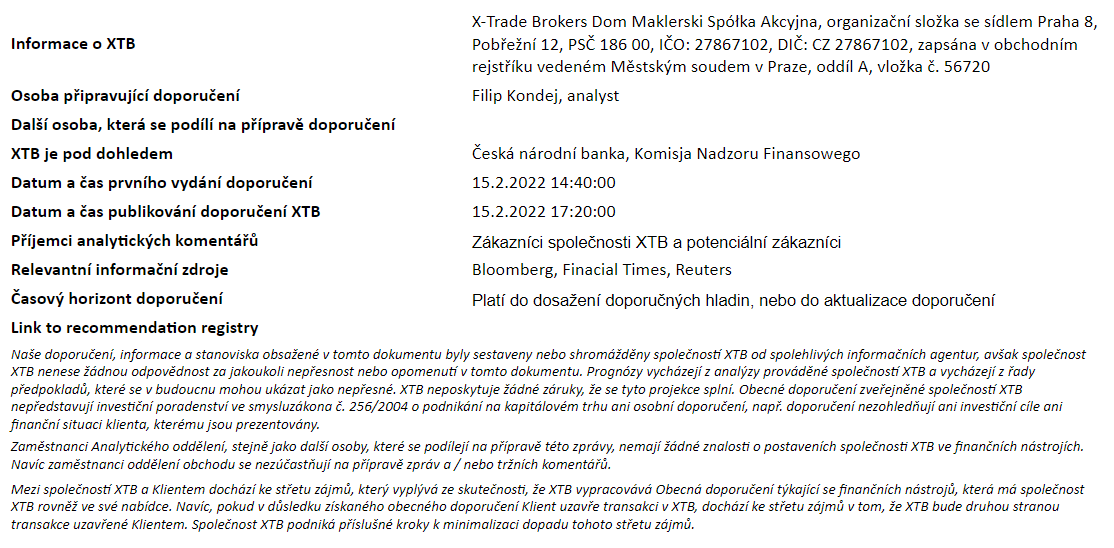 Tento materiál je marketingovou komunikáciou v zmysle čl. 24 ods. 3 smernice Európskeho parlamentu a Rady 2014/65/EÚ z 15. mája 2014 o trhoch s finančnými nástrojmi, ktorou sa mení smernica 2002/92/ES a smernica 2011/61/EÚ (MiFID II). Marketingová komunikácia nie je investičným odporúčaním ani informáciou odporúčajúcou alebo navrhujúcou investičnú stratégiu v zmysle nariadenia Európskeho parlamentu a Rady (EÚ) č. 596/2014 zo 16. apríla 2014 o zneužívaní trhu (nariadenie o zneužívaní trhu) a o zrušení smernice Európskeho parlamentu a Rady 2003/6/ES a smerníc Komisie 2003/124/ES, 2003/125/ES a 2004/72/ES a delegovaného nariadenia Komisie (EÚ) 2016/958 z 9. marca 2016, ktorým sa dopĺňa nariadenie Európskeho parlamentu a Rady (EÚ) č. 596/2014, pokiaľ ide o regulačné technické predpisy upravujúce technické opatrenia na objektívnu prezentáciu investičných odporúčaní alebo iných informácií, ktorými sa odporúča alebo navrhuje investičná stratégia, a na zverejňovanie osobitných záujmov alebo uvádzanie konfliktov záujmov v zmysle zákona č. 566/2001 Z. z. o cenných papieroch a investičných službách. Marketingová komunikácia je pripravená s najvyššou starostlivosťou, objektivitou, prezentuje fakty známe autorovi k dátumu prípravy a neobsahuje žiadne hodnotiace prvky. Marketingová komunikácia je pripravená bez zohľadnenia potrieb klienta, jeho individuálnej finančnej situácie a nijakým spôsobom nepredstavuje investičnú stratégiu. Marketingová komunikácia nepredstavuje ponuku na predaj, ponuku, predplatné, výzvu na nákup, reklamu alebo propagáciu akýchkoľvek finančných nástrojov. XTB S.A. organizačná zložka nezodpovedá za žiadne kroky alebo opomenutia klienta, najmä za nadobudnutie alebo predaj finančných nástrojov. XTB nezodpovedá za žiadnu stratu alebo škodu, vrátane, bez obmedzenia, akejkoľvek straty, ktorá môže vzniknúť priamo alebo nepriamo, spôsobená na základe informácií obsiahnutých v tejto marketingovej komunikácii. V prípade, že marketingová komunikácia obsahuje akékoľvek informácie o akýchkoľvek výsledkoch týkajúcich sa finančných nástrojov v nej uvedených, nepredstavujú žiadnu záruku ani prognózu budúcich výsledkov. Minulá výkonnosť nemusí nevyhnutne naznačovať budúce výsledky a každá osoba konajúca na základe týchto informácií tak robí výlučne na vlastné riziko.