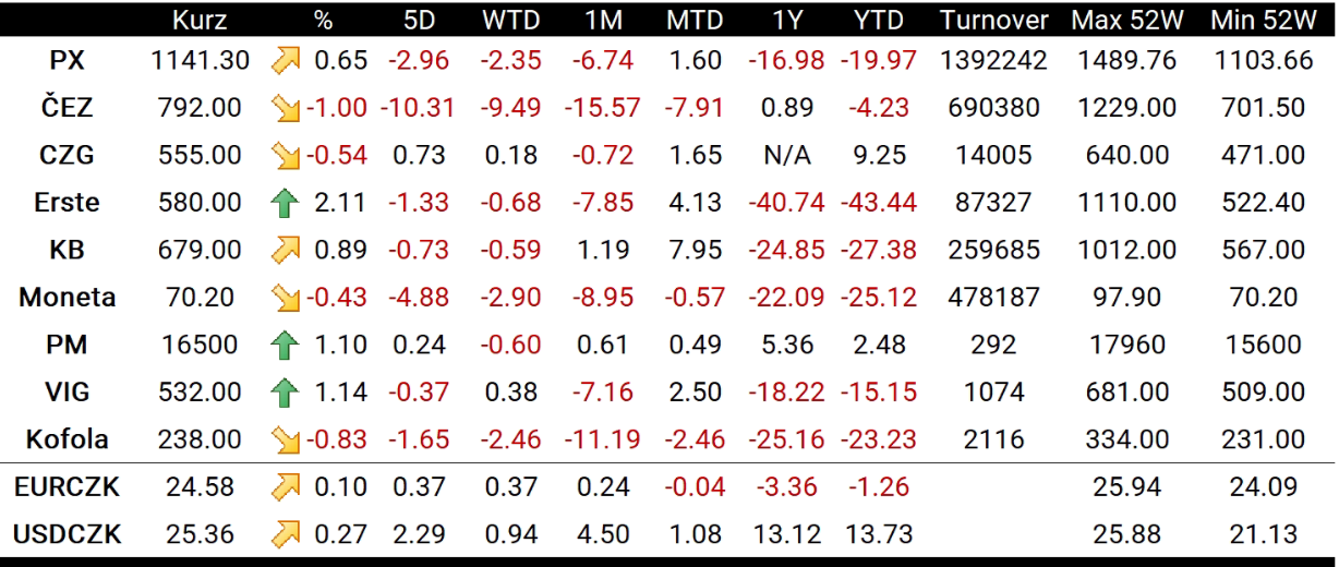 Nejvýkonnějším titulem pražské burzy byla ERSTE (RBAG.CZ), která podobně jako Komerční banka (KOMB.CZ) těží z pozitivního sentimentu, který na trh přivedla právě KB v souvislosti s návrhem na vyplacení štědré dividendy. Akcionáři ČEZ (CEZ1.CZ) nadále negativně vstřebávají informace o windfall tax a akcie společnosti nadále prodávají. Energetická skupina uzavřela dnešní seanci o 1 % níže na 792 Kč, což je nejmenší jednodenní ztráta v tomto týdnu.