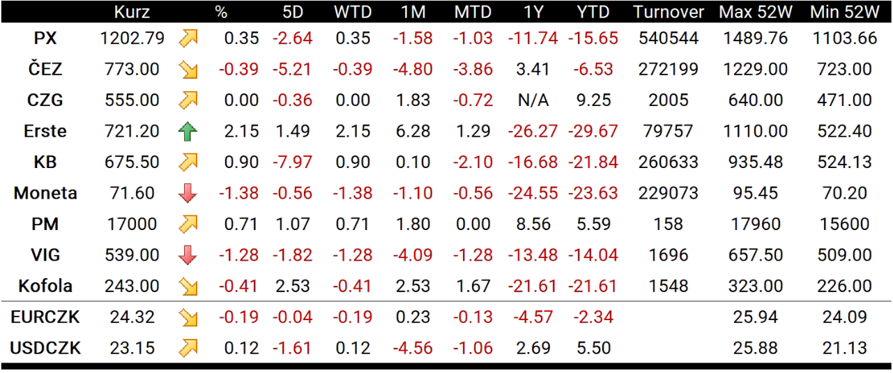 Nejvýkonnějším titulem pražského indexu se dnes stala Erste (RBAG.CZ), která získala 2,15 % a uzavřela na 721,20 Kč za akcii. Komerční banka (KOMB.CZ) si narozdíl od Monety (MONET.CZ) taktéž připsala zisky a obchodování uzavřela na 675,50 Kč za akcii. Moneta dnes ztratila 1,38 % své tržní kapitalizace. Energetická společnost ČEZ (CEZ1.CZ) ztratila 0,39 % a seanci ukončila na 773 Kč za akcii.