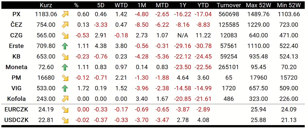 Nejvýkonnějším titulem pražského indexu se dnes stala Vienna Insurance Group (VIG.CZ), která získala 1,72 %. Na rozhodnutí ČNB dnes pozitivně zareagovaly akcie Erste (RBAG.CZ) a Monety (MONET.CZ), jež získaly shodně 1,11 %, zatímco Komerční banka (KOMB.CZ) poklesla o 0,23 % na 653 korun za akcii. Akcie ČEZ (CEZ1.CZ) dnes získaly 0,13 % a seanci ukončily na 754 korunách.
