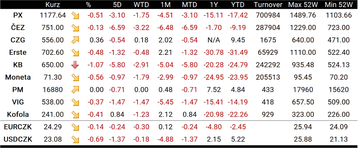 Nejvýkonnějším titulem pražského indexu se dnes stala Česká zbrojovka (CZG.CZ), která získala 0,36 % a uzavřela na 556 Kč za akcii. Z bank dnes nejvíce ztrácela Komerční banka (KOMB.CZ), jež klesla o 1,07 % na 650 Kč za akcii. Erste (RBAG.CZ) odepsala 0,48 % a Moneta (MONET.CZ) ztratila 0,56 % ze své tržní kapitalizace. ČEZ (CEZ1.CZ) dnes ztratil pouze 0,13 %.