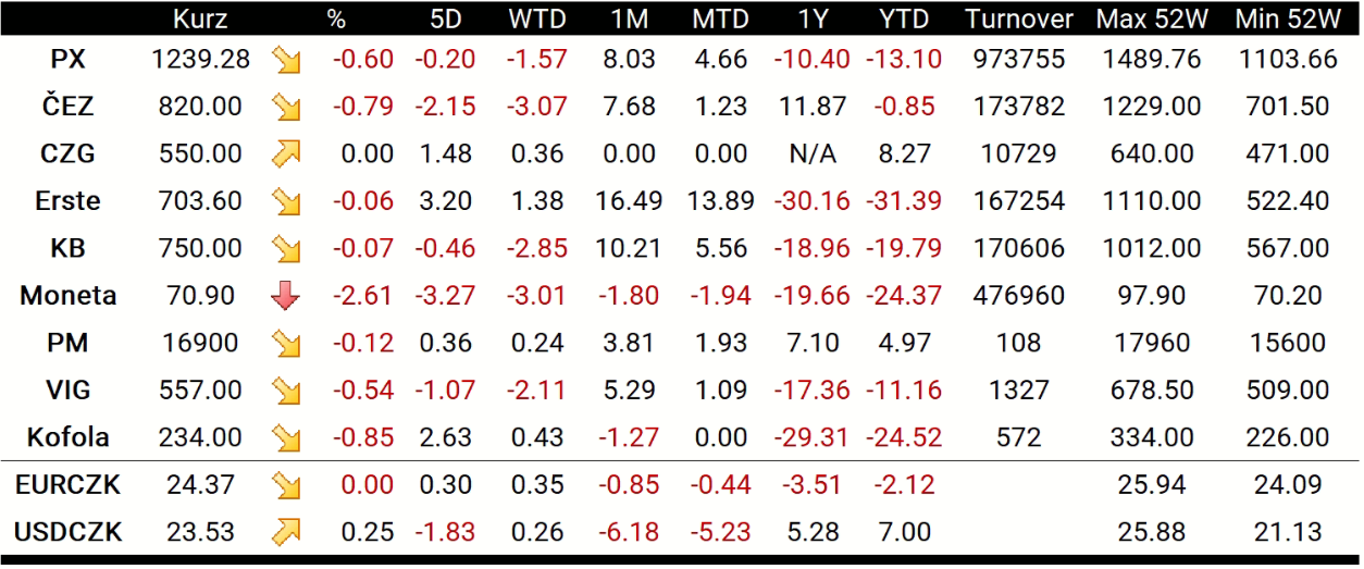 Nejvýkonnějším titulem pražského indexu se dnes stala Česká zbrojovka (CZG.CZ), která se obchodoval do strany, zatímco Moneta (MONET.CZ) odepsala 2,61 % a seanci uzavřela na 70,90 Kč za akcii. Akcie Komerční banky (KOMB.CZ) se dnes obchodoval s mírnou ztrátou a uzavřely o 0,07 % níže na 750 Kč za akcii. Podobnou výkonnost zaznamenala i Erste (RBAG.CZ), jež uzavřela na 703,6 korunách za akcii. Akcie energetické skupiny ČEZ (CEZ1.CZ) uzavřely na 820 Kč, společnost tak dnes poklesla o 0,79 %.